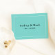 Tarjetas de notas personalizadas de estilo plano que presentan un diseño elegante y sofisticado y monograma del apellido de casados de una novia y un novio, con espacio en la parte posterior para un mensaje escrito a mano. Esquema de color azul acuático / huevo de petirrojo, negro y blanco.