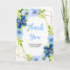 Esta hermosa y elegante tarjeta de agradecimiento para bodas incluye flores de color azul marino y azul marino con follaje en un marco geométrico dorado. El texto combina el guión manuscrito y las fuentes serif para un aspecto elegante y moderno. Es perfecto para un boda rústico de primavera o verano.