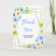 Esta hermosa y elegante tarjeta de agradecimiento de boda presenta el color azul acuático olvido-me-nots, margaritas y follaje sobre un marco geométrico dorado. El texto combina el guión manuscrito y las fuentes serif para un aspecto elegante y moderno. Es perfecto para un boda rústico de primavera o verano.