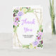 Esta hermosa y elegante tarjeta de agradecimiento de boda incluye flores moradas acuáticas y follaje en un marco geométrico dorado. El texto combina el guión manuscrito y las fuentes serif para un aspecto elegante y moderno. Es perfecto para un boda rústico primaveral.