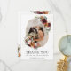 Esta elegante tarjeta de agradecimiento de boda cuenta con un marco geométrico dorado adornado con hermosas flores de acuarela en rojo burdeos, naranja quemada / óxido, rosa y marfil. Diseñado para coincidir con nuestra colección de boda Rustic Blooms. Personalízala con tu foto de boda favorita y detalles de manera fácil y rápida, simplemente presiona el botón personalizar para reorganizar y dar formato al estilo y ubicación del texto. (c) The Happy Cat Studio