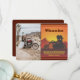 Esta tarjeta de agradecimiento del boda fotográfico muestra a una pareja de siluetas montando una motocicleta con un fondo de puesta de sol o amanecer.