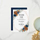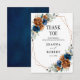 Tarjeta de agradecimiento de boda con tema floral elegante azul marino, terracota, naranja tierra con un ramo elegante de rosas de color azul marino, peonías de color terracota y hojas de eucalipto verdes. Por favor, contácteme para cualquier ayuda en personalización o si necesita algún otro producto con este diseño.