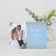 Personalizar esta elegante tarjeta de agradecimiento de boda con su foto vertical de boda a la izquierda. Las palabras "gracias" aparecen a la izquierda en el guión de escritura a mano en blanco, con florecientes al principio y al final. Agregue un mensaje de su elección en texto cursiva blanco sobre un fondo azul bebé pastel con bordes falsos de purpurina plateado. Añade tus nombres y la fecha de boda al revés sobre un símbolo azul pálido.