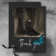 Este diseño de tarjetas de agradecimiento a los bodas presenta un tema oscuro y amoroso que es sencillo pero impresionante. Un fondo negro oscuro de carbón vegetal es el lienzo perfecto para tu foto boda. Una polilla azul verde azulada, con sus alas extendidas, está encaramada en un rincón. Único y elegante, este diseño se puede utilizar en cualquier temporada. Creado por Simply Farmhouse Press.