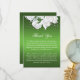 Una hermosa tarjeta de agradecimiento de boda verde y blanca con un hermoso ramo de rosas blancas de novia en la parte superior. Esta elegante tarjeta de agradecimiento de esmeralda verde se puede personalizar fácilmente con su propio texto. La parte posterior de la tarjeta presenta el mismo verde vibrante, con un solo ramo de rosas blancas en el centro.