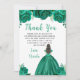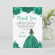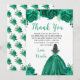 This Quinceanera thank you card features faux glitter green floral flowers and a beautiful princess with brown hair and an elegant dress. This is perfect for a Quinceanera birthday party.