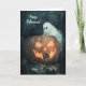 Feliz saludo de Halloween con una hermosa y divertida escena de Halloween con un gato negro y un fantasma buscando otro gato negro dentro de una calabaza de Jack o Lantern