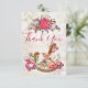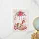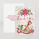 Una tarjeta de agradecimiento a los navidades festivos. El fondo es un collage de estilo vintage con una imagen descolorida de rosas rosadas, hojas verdes y escritura francesa. Encendido sobre la parte superior, hay un ramo de navidades de bonito y un caballo victoriano mecedor rodeado de peonías y postes rosados de bonito. Mensaje personalizado en la parte de atrás.