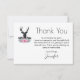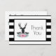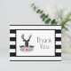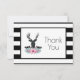 Una tarjeta de agradecimiento de fiesta con una cabeza de ciervo negra con grandes cuernos. Líneas geométricas dentro de la cara del ciervo agregan un toque creativo. Flores rosadas coloridas y hojas verdes menta forman un bonito ramo floral debajo de su cabeza. Un boceto de una cordillera colocado entre las flores también agrega al ambiente rústico de campo. El fondo es un patrón de rayas negras y blancas. Mensaje personalizado en la parte posterior que puedes personalizar.