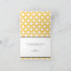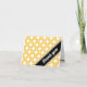 Tarjetas de agradecimiento con un patrón de lunares surtidos con círculos blancos de tamaños alternados sobre un amarillo estilo café. "Gracias" está impreso en diagonal en blanco en la parte frontal sobre una franja negra diagonal en la esquina inferior derecha. El interior está impreso personalizado con su propio texto, o puede dejarse en blanco fácilmente escribiendo a mano sus propios sentimientos de agradecimiento. Alrededor de esta área de texto de plantilla está el mismo patrón de lunares surtidos, un elemento único en lugar del típico interior blanco. Este estilo y esquema de colores hacen que estas tarjetas sean una opción apropiada para despedidas de soltera, baby showers y cumpleaños.