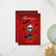 Calabaza Mágica y Diversión Humana. En medio de un oscuro cementerio, un alegre esqueleto personalizado se alza sobre un montón de piedras templadas. El esqueleto, con sus extremidades óseas y su maliciosa sonrisa, lleva un impresionante arco rojo alrededor de su cuello y ha apuntado cuernos del diablo que le dan una expresión juguetona pero traviesa. En su mano derecha, sostiene orgullosamente una linterna en forma de calabaza brillante sobre un palo largo, cuya cálida luz irradia suavemente en el entorno. El fondo del diseño es un rojo vibrante que subraya el espíritu festivo de Halloween.
