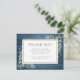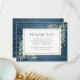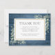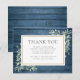 Una tarjeta conmemorativa de funeral elegante que presenta follaje botánico de acuarela sobre un fondo de madera azul rústica. Puedes personalizarla con tu propio mensaje de agradecimiento. Diseñada por Thisisnotme©