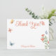 Tarjeta de agradecimiento personalizable en tipografía naranja con una encantadora y delicada ilustración de flores silvestres y mariposas de acuarela en la parte frontal con amplio espacio en blanco para escribir un mensaje de agradecimiento manuscrito. La parte trasera de la tarjeta de agradecimiento tiene un hermoso patrón de flores silvestres y mariposas.