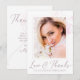 Envía a tu familia y amigos esta tarjeta moderna de agradecimiento con foto para tu despedida de soltera. Esta elegante plantilla de diseño presenta tu foto en la portada con un fino marco de color rosa polvoriento acentuado por flores de cerezo en acuarela en tonos de rosa sonrosado. Abajo, en una letra a mano, se lee "Amor y agradecimiento" con tu nombre debajo para personalizar. La parte trasera de la tarjeta tiene tu mensaje de agradecimiento acentuado por una suave flor de cerezo en acuarela debajo del texto. Personaliza tu mensaje de agradecimiento y firma. Diseñado por la artista ©Susan Coffey.