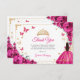 Fuchsia pink, gold and white Quinceanera thank you card. Features brunette girl in ball gown dress, script font, gold butterflies, hot pink roses and tiara. Perfect for an elegant princess style glam celebration. Personalize with your own details.
