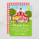 Esta linda y divertida tarjeta de agradecimiento presenta a una niña rubia de piel clara junto a un granero rojo con una veleta de gallo. Hay adorables animales de granja como una vaca, un cerdo y una gallina. Al fondo hay un cielo azul brillante, manzanos, sol, mariposas y margaritas. El texto combina fuentes en negrita y sans serif para un look elegante y moderno. Esto es perfecto para una fiesta de cumpleaños con tema de granja.