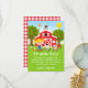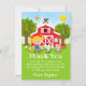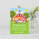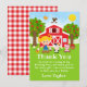 Esta linda y divertida tarjeta de agradecimiento presenta a una niña de pelo rubio con piel clara junto a un granero rojo con una veleta de gallo. Hay adorables animales de granja como una vaca, un cerdo y una gallina. Al fondo hay un cielo azul brillante, manzanos, sol, mariposas y margaritas. El texto combina fuentes en negrita y sans serif para un estilo moderno y elegante. Esto es perfecto para una fiesta de cumpleaños con tema de granja.