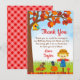 Esta tarjeta de agradecimiento linda y divertida presenta a un espantapájaros con una camisa de cuadros rojos y pantalones de mezclilla azules y un sombrero. Al fondo hay un árbol con hojas de otoño, una casa para pájaros, una ardilla escarbando en busca de nueces, un adorable cuervo sobre una calabaza y un hongo. El texto combina letra manuscrita y fuentes sans serif para un estilo moderno y elegante. Es perfecto para un cumpleaños de otoño.