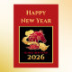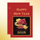 Happy New Year 2026 Lunar New Year's red, gold, and black card with Year of the Horse stylized artwork. The text is customizable if you wish. The front of this card features the text "Happy New Year" and "Lunar New Year 2026" plus a stylized horse among fancy scrolling clouds. The back of this card has gold text: "Wishing you happiness and prosperity. May this New Year bring you good health and good fortune." Make sure to update your family name or remove the name if you prefer to sign with a pen.