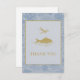 Serene and sophisticated, this Chinoiserie thank-you card captures the tranquility of a lily-covered pond in soft periwinkle and gold. The outer border features a delicate toile of lotus blossoms, lily pads, and dragonflies, framing a clean white center bordered in gold. At the heart of the design, a graceful gold koi swims beneath a hovering dragonfly — a timeless symbol of peace and renewal.