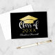 Celebra con estilo con esta impresionante tarjeta de agradecimiento de graduación que presenta un sombrero de graduación metálico dorado falso sobre un fondo negro rico. El guión blanco y los acentos dorados enmarcan el año de tu clase y el nombre personalizado para un look lujoso y atemporal. Personaliza el nombre y el año para una tarjeta que brille tan fuerte como tu logro.