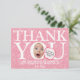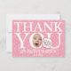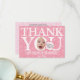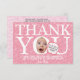 Fiesta de cumpleaños divertida Gracias tarjeta con globo de historietas rosadas y flores rosadas simples. Puede crear una tarjeta de agradecimiento original y divertida reemplazando la foto de la cara cuadrada que tiene con una foto de muestra. También personalizar tu propia tarjeta intercambiando las cuatro fotos de atrás. Comparte los maravillosos momentos de la fiesta de cumpleaños con la familia y amigos, acompañados de gratitud, con esta tarjeta de agradecimiento. Es perfecto para la fiesta de primer cumpleaños de una niña y deleitará a tu familia y amigos. ¡Por favor, escurra una broma ingeniosa en la burbuja del discurso!