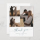 Esta tarjeta de agradecimiento de boda blanco y verde azulado de moda boho es perfecta para un boda minimalista. El moderno diseño bohemio azul verde y blanco presenta una caligrafía rústica sencilla con un estilo único y clásico que recuerda a la playa de la costa y a un crucero oceánico de verano. Personalice la tarjeta con tres fotos de su día de boda, sus nombres y fecha de boda. Borra el texto de ejemplo en la parte posterior de la tarjeta para que puedas escribir a mano una nota reflexiva a cada invitado, o hacer que se imprima un mensaje.
