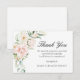 Bonito y elegante arreglo floral rosa decora el lado izquierdo de esta tarjeta de agradecimiento del funeral. Gracias está escrito en caligrafía elegante.