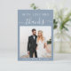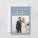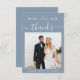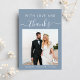 Elegante tarjeta azul polvoriento boda de agradecimiento con la foto del día de la boda, "Con amor y gracias" en una mezcla de simple y moderna tipografía blanca y un guión blanco de moda con toques y tu nombre y fecha boda unidos por un corazón. En la parte posterior, personaliza tu mensaje de agradecimiento y agrega tus nombres en un script tipo firma.
