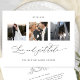 ¡Gracias a sus invitados con esta elegante tarjeta de agradecimiento monogramada de tres bodas de collage! Diseño blanco y negro limpio y sencillo, lleno de elegancia y gracia. Frase "con amor y gratitud" en caligrafía escrita a mano moderna. Volver con elegante monograma dibujado a mano con iniciales de parejas y área para su mensaje. Fácil plantilla donde puede añadir sus imágenes, Zazzle hará todo el trabajo y las añadirá en la forma cuadrada, tamaño y posición adecuados para usted! Posibilidad de añadir un mensaje "impreso" en la parte posterior - O - dejar la sección de texto en blanco para poder escribir mensajes personales a mano más adelante. Disponible en varias opciones de tamaño. También está disponible el mismo diseño con texto en Relieve metalizado de oro falso. Parte de nuestra colección "Elegance Minimal Black and White Monogram Boda" con una variedad de productos de coordinación disponibles. Visita toda la colección en: https://www.zazzle.com/collections/elegance_minimal_black_and_white_monogram_wedding-119677926842478970