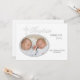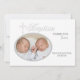 El fondo blanco tiene la palabra "Bautismo" y está adornado con una cruz plateada intrincada. La ventana de la foto ovalada también está enmarcada en plata. Coordina perfectamente con nuestra Invitación de Foto con Palabra de Bautismo en Plata.