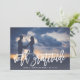 Una tarjeta de agradecimiento boda moderna diseñada para acomodar tu foto boda horizontal o paisajista favorita. "Con gratitud" aparece en la parte inferior como un texto en blanco en las letras del pincel de estilo manuscrito, con sus nombres y la fecha del boda debajo. Agregue un mensaje opcional a la parte posterior con el patrón sutilmente indicado utilizando el campo proporcionado, o elimine el texto de ejemplo para agregar su propio mensaje de agradecimiento escrito a mano.