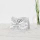 El diseño presenta un fondo de falso satén blanco para el monograma de la pareja recién casada. El centro muestra la inicial del apellido en una fuente grande, elegante y plateada. La primera inicial de la novia y el novio se muestran a ambos lados con la misma fuente, pero más pequeña. Las palabras "GRACIAS" aparecen debajo. El interior queda en blanco.