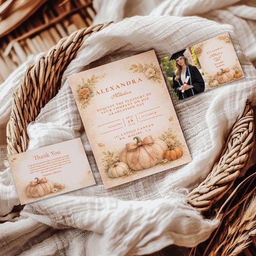 Warm autumn tones meet elegant celebration styling in this pumpkin and floral graduation design. A hand-painted heirloom pumpkin sits surrounded by soft peach blooms, muted greenery, and golden foliage, creating a romantic harvest aesthetic. The delicate wreath framing and warm ivory background give it a refined, feminine feel while still embracing cozy fall charm.