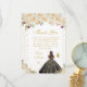 This elegant and glamorous birthday thank you card features a beautiful princess with brunette hair and fair skin in a black ball gown. The text combines handwritten script and modern sans serif fonts for a classy and sophisticated look. The floral arrangements, butterflies and gold confetti create the perfect blend of rustic and chic.