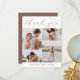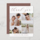 Las elegantes tarjetas de agradecimiento para bodas cuentan con cuatro fotos dispuestas en un diseño de collage de rejilla. "Gracias" aparece en la parte superior de la escritura de caligrafía de terracota oscura de moda, con sus nombres a lo largo de la parte inferior en letras de bloques clásicas. Añadir un mensaje personal y una firma al reverso.