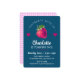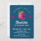 TARJETA DE INVITACIÓN DE CUMPLEAÑOS DE NIÑA CON FRESAS Y CORAZONES SOBRE FONDO AZUL VERDE OSCURO Y REVÉS A CUADROS ROSA.