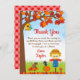 Esta divertida y linda tarjeta de agradecimiento presenta a un espantapájaros con una camisa de cuadros rojos y pantalones de mezclilla azules y un sombrero. Al fondo hay un árbol con hojas de otoño, una casa de pájaros, una ardilla que busca nueces, un adorable cuervo sobre una calabaza y un hongo de sombrerito. El texto combina letra manuscrita y fuentes sans serif para un estilo moderno y elegante. Esto es perfecto para un cumpleaños de otoño.