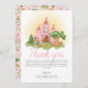 Esta tarjeta de agradecimiento de cumpleaños linda y femenina presenta un castillo encantado caprichoso rosa, con un príncipe, princesa y flores. ¡El diseño mágico perfecto para el cumpleaños de tus hijos!