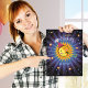 Una tarjeta de cumpleaños divertida para tu hermana. El sentimiento dice: "Hoy es tu día para ser el centro del Universo. "Un naranja sonriente, un sol amarillo y rojo con un gorra fiesta y un soplador irradia felicidad a todas las estrellas celestiales de tiro.