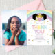 Esta es una invitación de cumpleaños con tema de unicornio afro puff y arcoíris con foto.