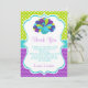 Esta tarjeta de agradecimiento de fiesta de cumpleaños presenta un lindo pavo real púrpura y verde