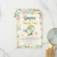 Esta adorable tarjeta de agradecimiento de gnomo ilustrada a mano es la forma perfecta de expresar gratitud después de una mágica celebración del primer cumpleaños. Con un caprichoso gnomo verde rodeado de flores pastel suaves, este encantador diseño combina perfectamente con la invitación de cumpleaños de gnomo con tema de bosque. La tipografía juguetona y la paleta de colores cálidos crean un recuerdo sincero y memorable. Ideal para una fiesta de San Patricio con tema de cuento de hadas, bosque o jardín encantado.