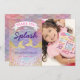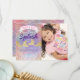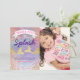 Tarjetas de agradecimiento de cumpleaños bajo el mar que presentan una foto de su hijo, un fondo de patrón de concha de sirena pastel colorido, brillo dorado y rosa, algas marinas, dos colas de sirena con brillo dorado, y una plantilla de agradecimiento para fiestas infantiles linda y fácil de personalizar.