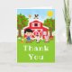 Esta tarjeta de agradecimiento adorable y divertida presenta a un chico con cabello negro y piel clara junto a un granero rojo con una veleta de gallo. Hay adorables animales de granja como una vaca, un cerdo y una gallina. En el fondo hay un cielo azul brillante, manzanos, sol, mariposas y margaritas. El texto combina fuentes en negrita y sans serif para un estilo elegante y moderno. Esto es perfecto para una fiesta de cumpleaños con tema de granja.