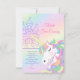 Arte de unicornio arcoíris pastel con fondo de lavado de acuarela e ilustración delicada de castillo. Este diseño caprichoso de cuento de hadas presenta tipografía de letra elegante y tonos pastel soñadores, perfecto para la celebración de una fiesta de cumpleaños mágica para niñas.