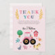 Este diseño de tarjeta de agradecimiento de cumpleaños para niñas, lindo y rústico, cuenta con dibujos animados de animales de granja, con un tractor rosa, caballo, cerdo, conejo, gallinas, granero rojo y flores, y se puede personalizar con los nombres de los padres (o del niño). La adición moderna perfecta con tema de granja para el cumpleaños de tus niños.