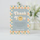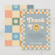 Esta tarjeta de agradecimiento de cumpleaños número uno para niños captura las vibraciones retro de los 70 con un tema azul adorable y un patrón de cuadros pastel. Totalmente personalizable, incluye espacio para tu mensaje y nombre. Perfecta para un cumpleaños boho "One Cool Dude".