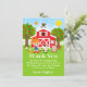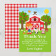 Esta divertida y linda tarjeta de agradecimiento presenta a una chica pelirroja de piel clara junto a un granero rojo con una veleta de gallo. Hay adorables animales de granja como una vaca, un cerdo y una gallina. Al fondo hay un cielo azul brillante, manzanos, sol, mariposas y margaritas. El texto combina fuentes en negrita y sans serif para un look elegante y moderno. Esto es perfecto para una fiesta de cumpleaños con tema de granja.